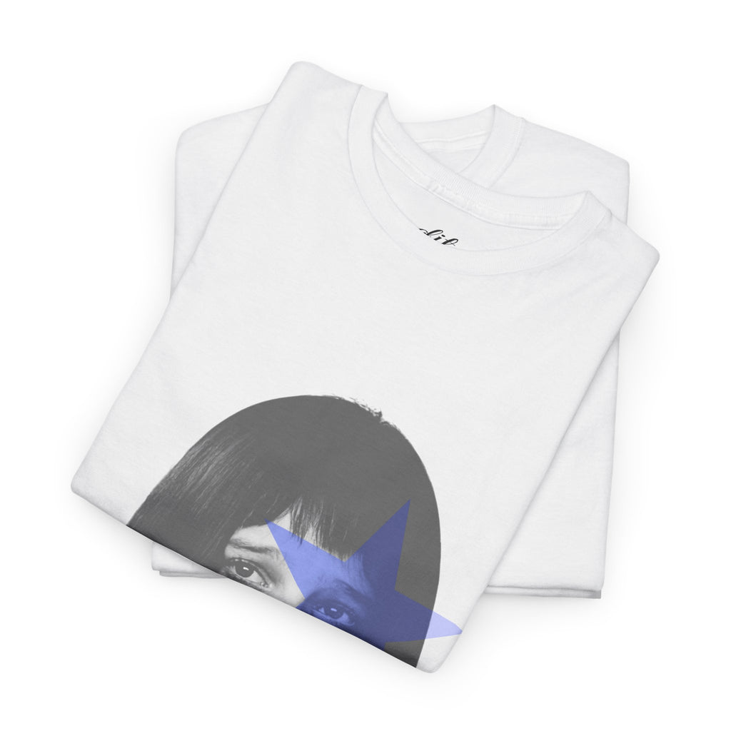 Chaque t-shirt présente une icône, sublimée par notre signature : l'étoile emblématique qui vient révéler la lumière intérieure et l'aura mythique de ces figures légendaires.